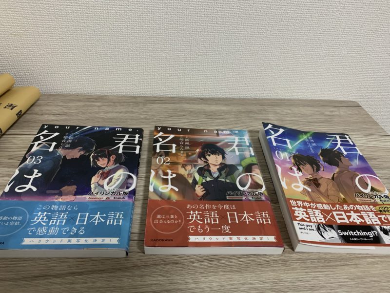 やっぱりどこかで聞いたことあるような感じだけど、でも、日本語付きの英文の本を買おう!って思って見て、結局「君の名は」の英語バージョンの漫画を1巻から3巻まで3冊購入しました(*^ω^*)