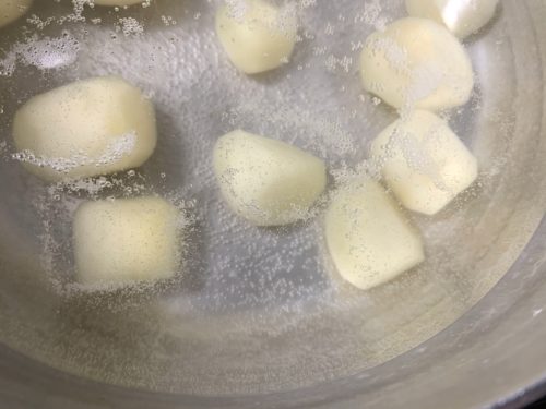 - じゃがいも皮を剥く、2、3センチの大きさに揃えてから角を取る(煮崩れにくい)水から茹でる