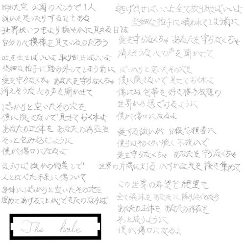 最近ハマってる歌 2020-10-01 最終更新日時 : 2020-10-02 haru King Gnu の「The hole」って曲がすごい最近好きです。 耳にこびりついて離れない笑 なんか泣けてきそうな歌詞 カラオケでめっちゃ歌います、めっちゃいい曲、、 声が優しい、、、 私はこれだけ守りたいって思える人に出会いたいなって思います、笑 歌詞書きたくなって歌詞を書きました iPadで字書くの慣れなくて時間かかってしまいました😅 「The hole」 ほんとにいい曲です、、 XCopy
